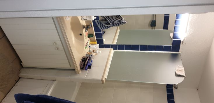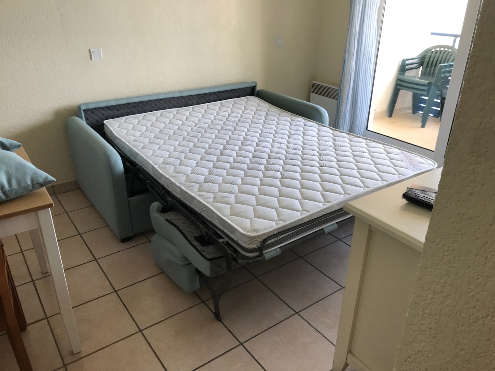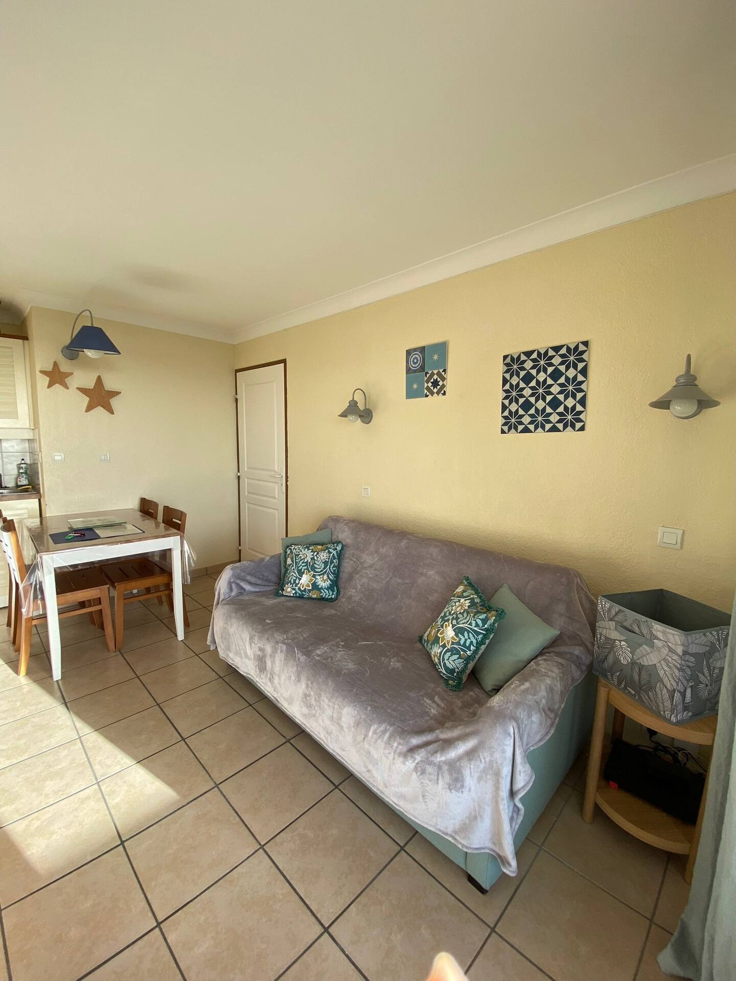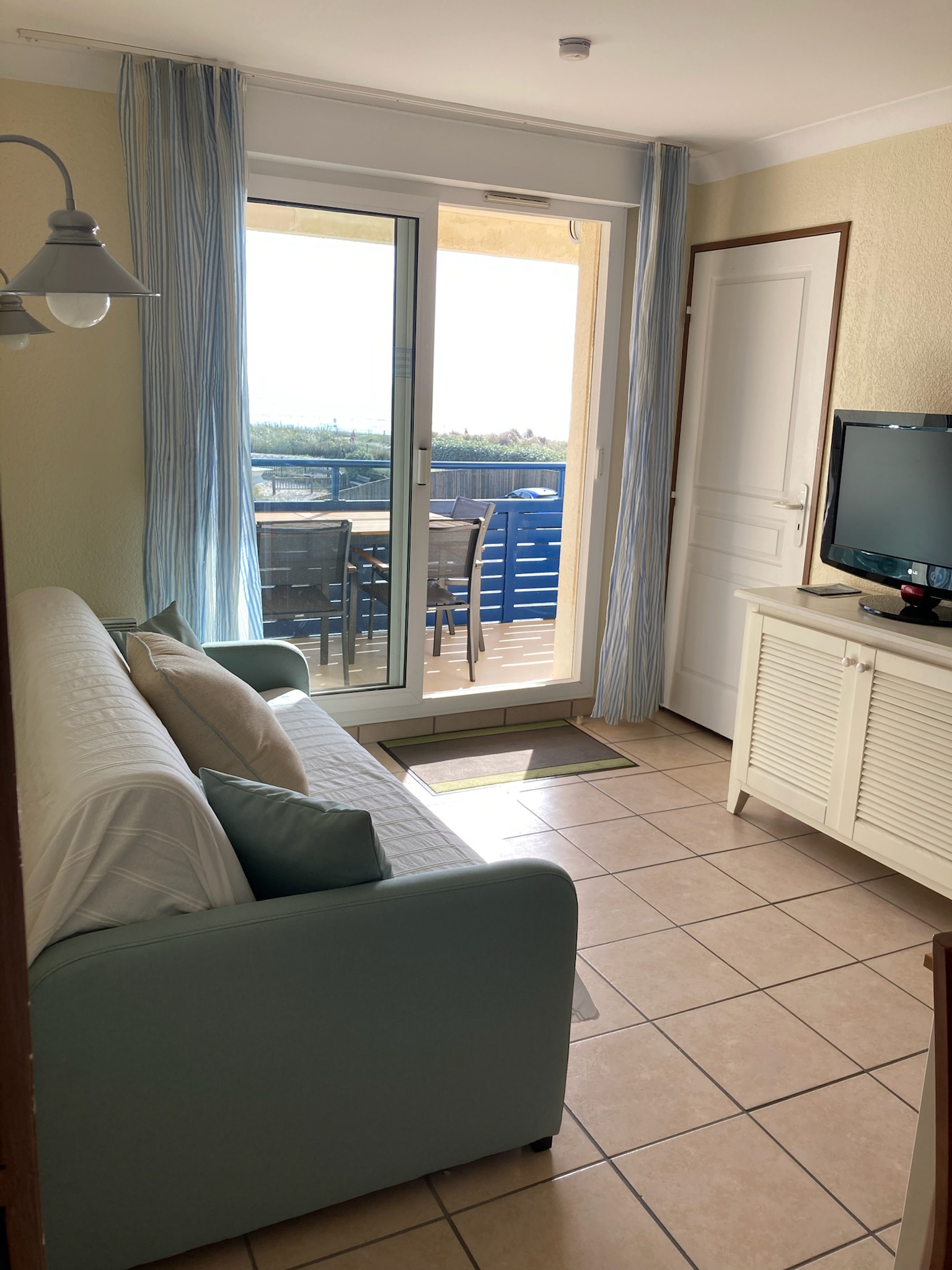 Salon vue mer avec canapé-convertible 140cm haut de gamme et très pratique ouvert en 2 secondes (vous pouvez garder le lit fait en refermant le convertible) télévision, …